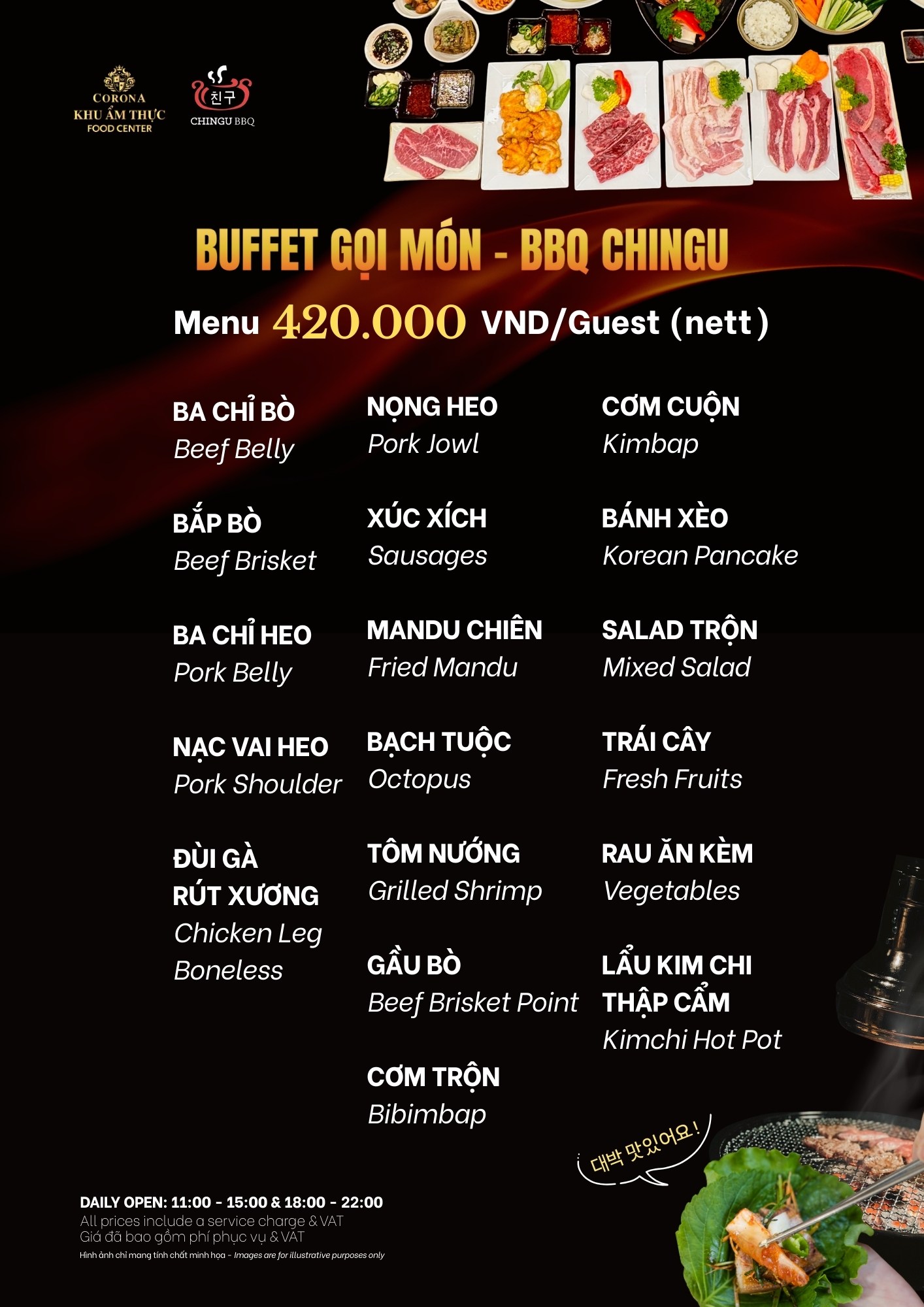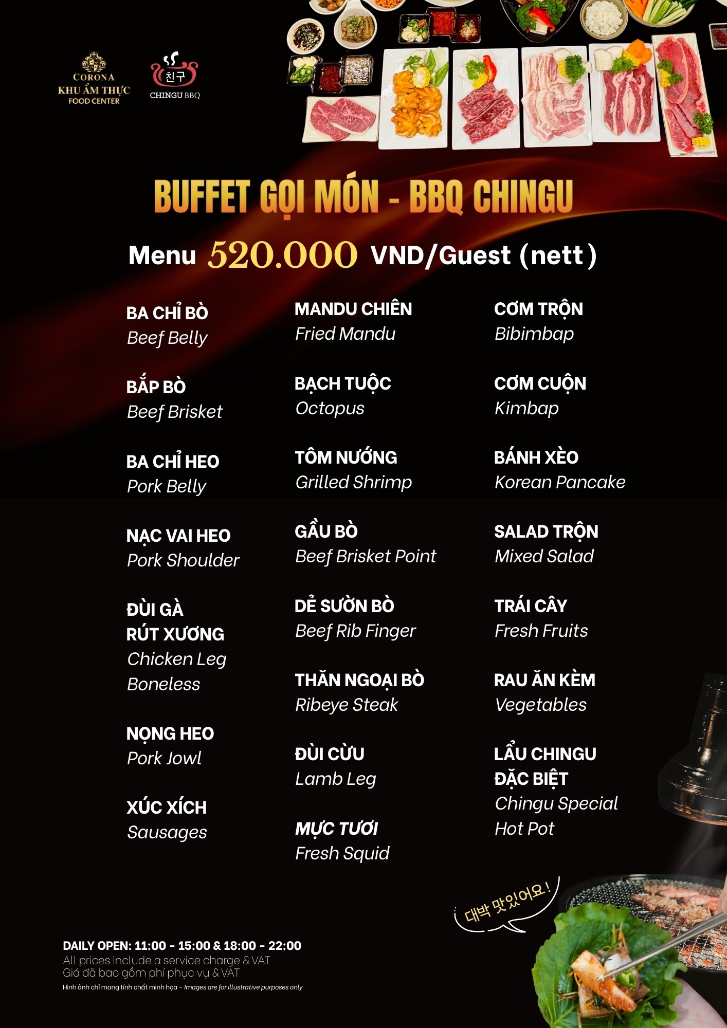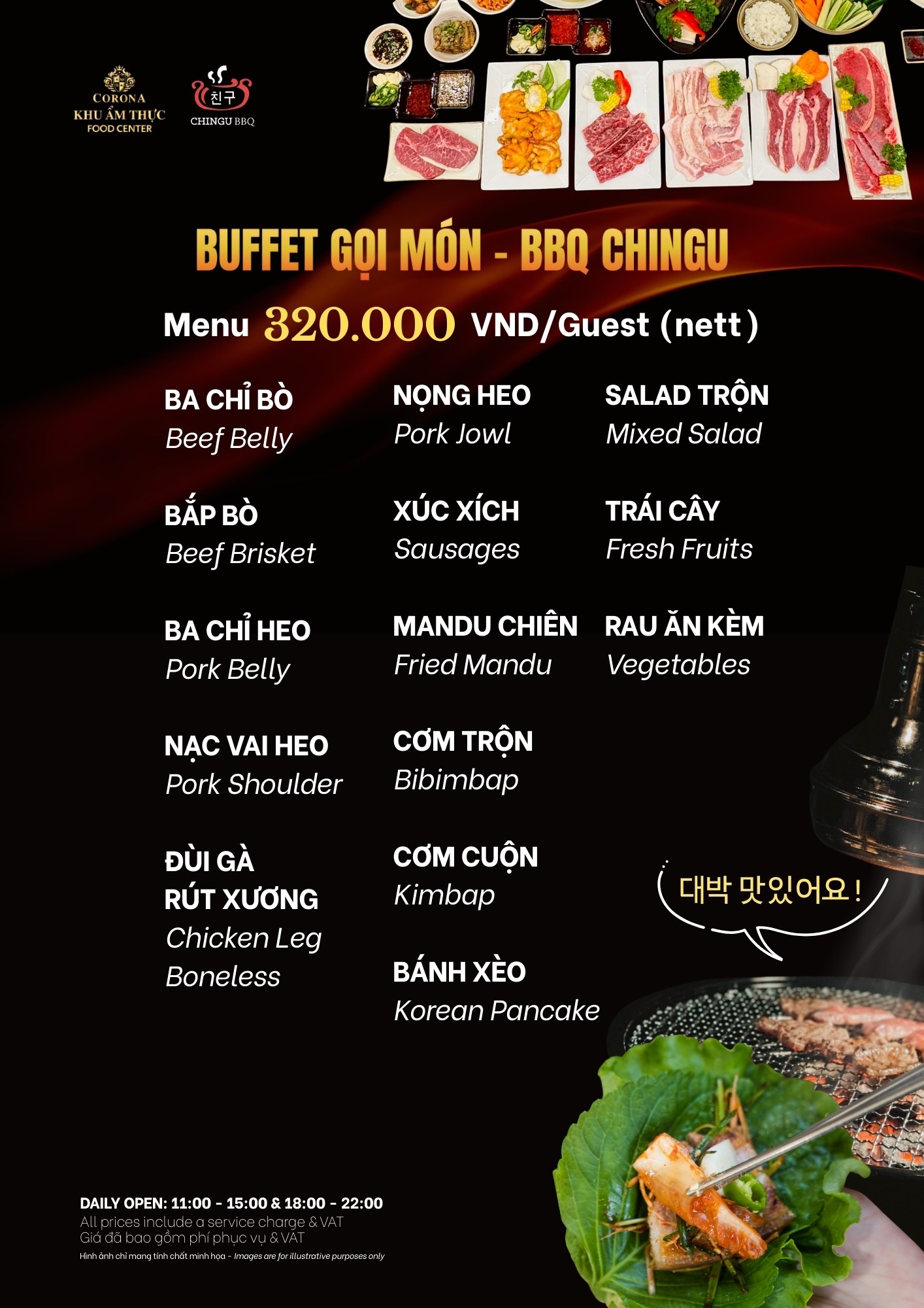 Chingu is a prominent restaurant in Phu Quoc at Corona Food Center, specializing in Korean hot pot and grilled dishes, bringing diners rich and attractive culinary experiences. With a modern, cozy and intimate design space, Chingu is an ideal place to enjoy meals with family and friends.